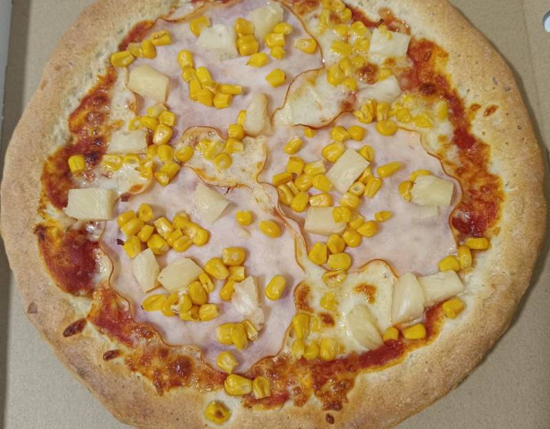 Ananász, Kukorica, Mozzarella sajt, Paradicsomos alap, Sonka