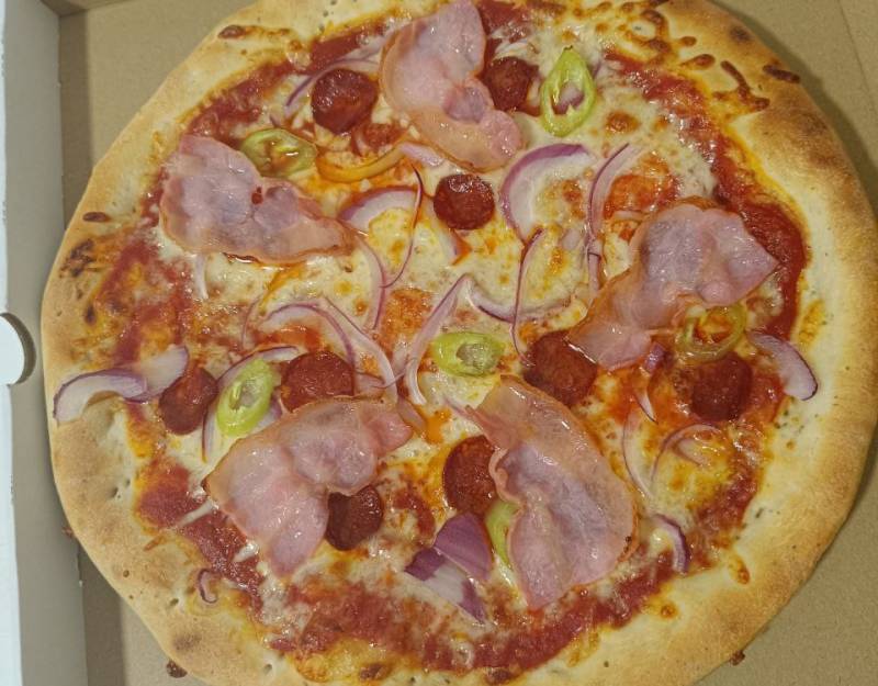 Bacon, Csípős paprika, Kolbász, Lilahagyma, Mozzarella sajt, Paradicsomos alap
