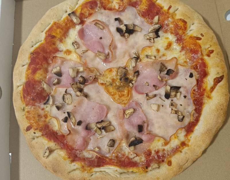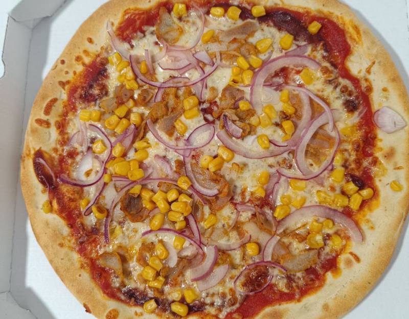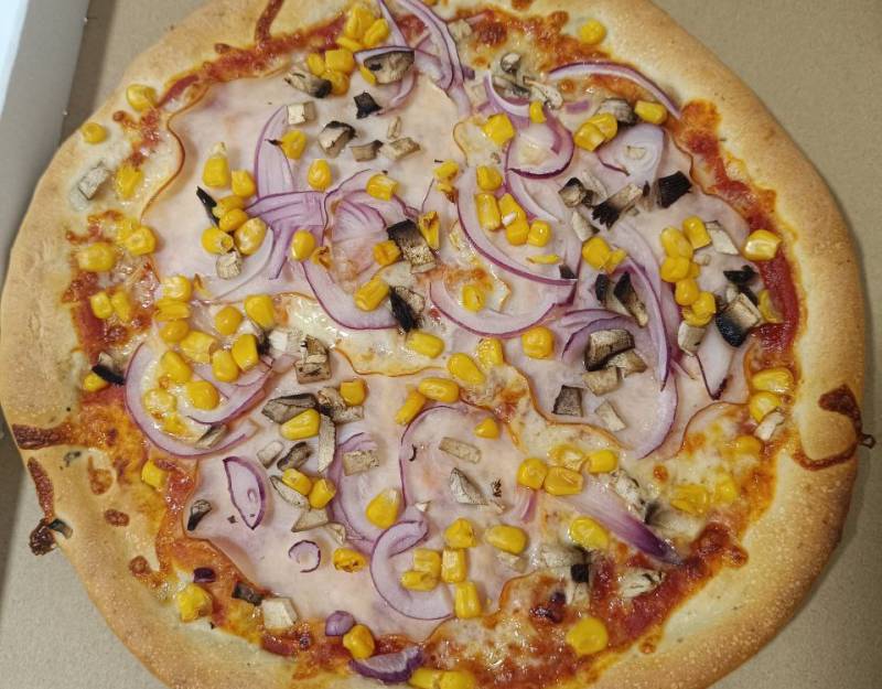 Gomba, Kukorica, Lilahagyma, Mozzarella sajt, Paradicsomos alap, Sonka
